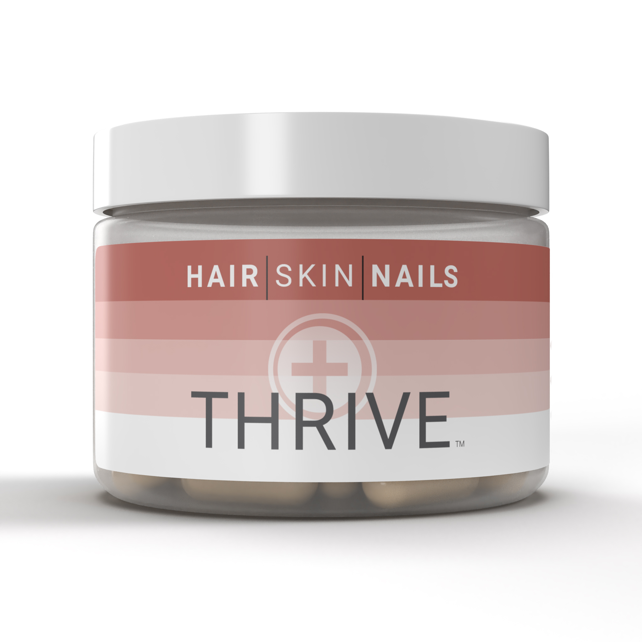 THRIVE Hair, Skin, Nails supplement was formulated with key ingredients like Hydrolyzed Collagen Types I & III and Keratin proven to help support hair and nail growth, joint and bone strength, while also giving you the antioxidant support to help reduce the effects of free radicals on the skin and promote skin health.